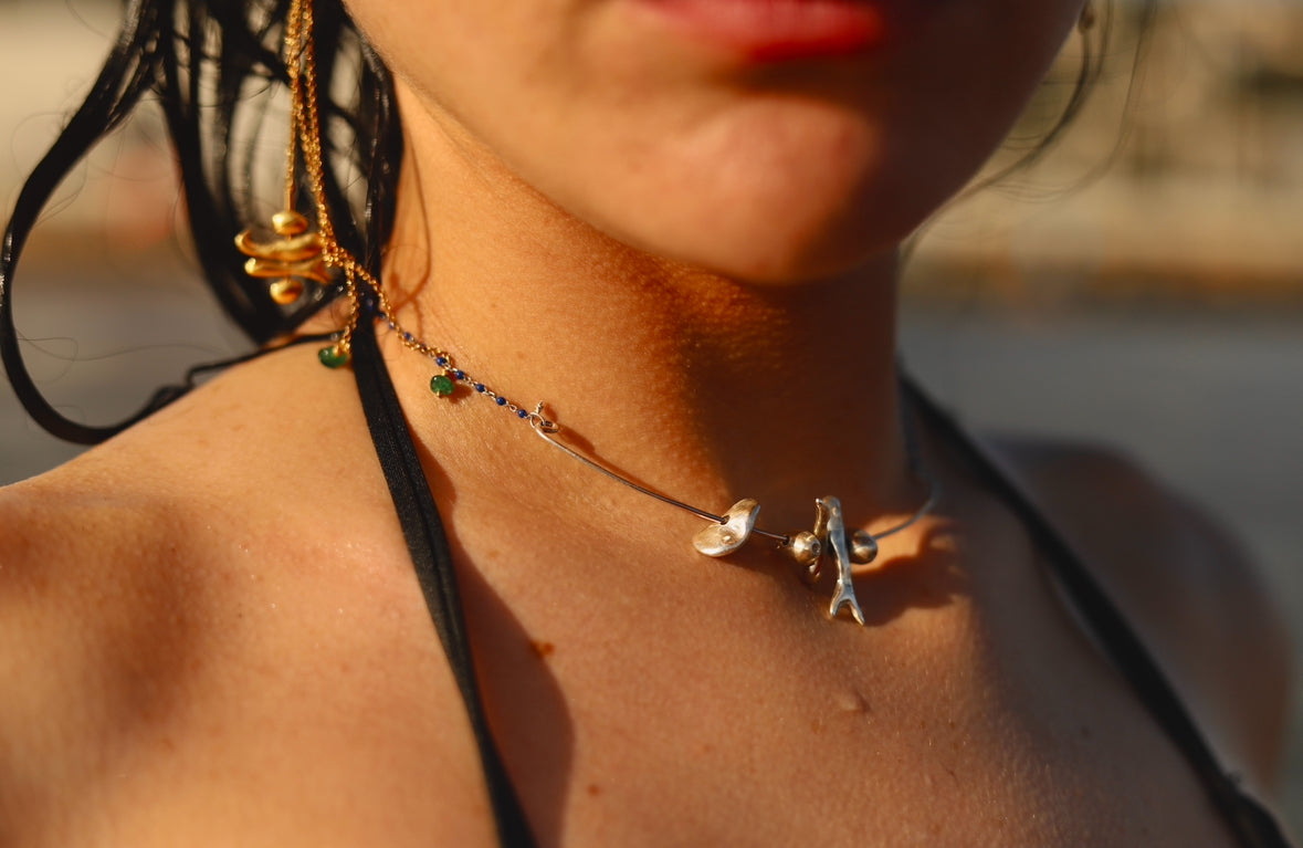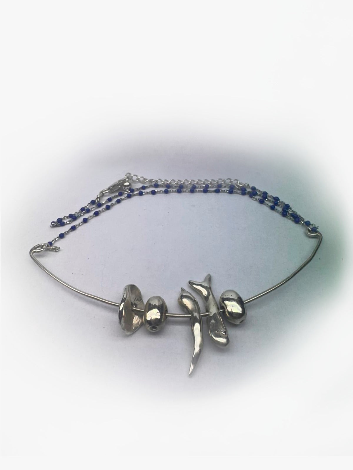 Gargantilla con forma de Gilda y con hilo de plata y esmalte en color azul. Se puede hacer otra disposición de ingredientes y mezclar acabados, para ello ponte en contacto conmigo para hacerte el presupuesto personalizado.